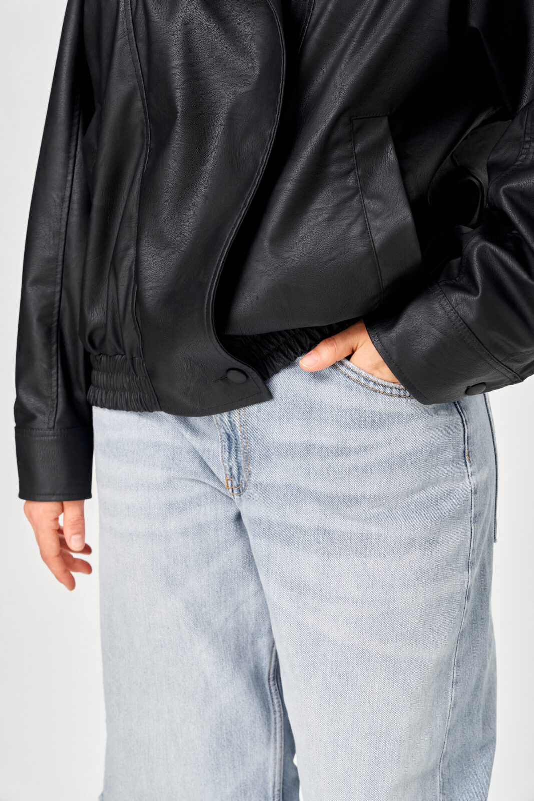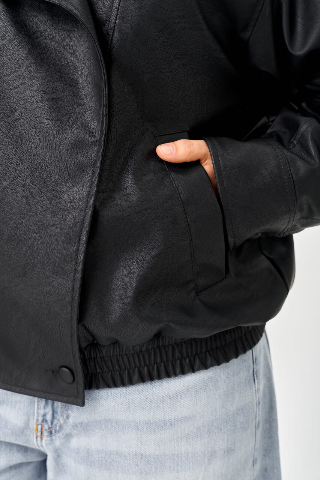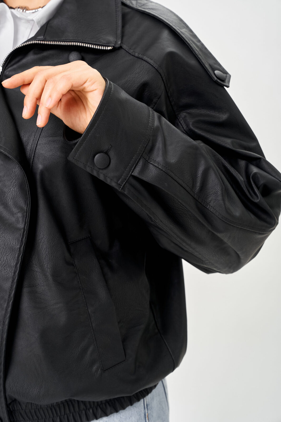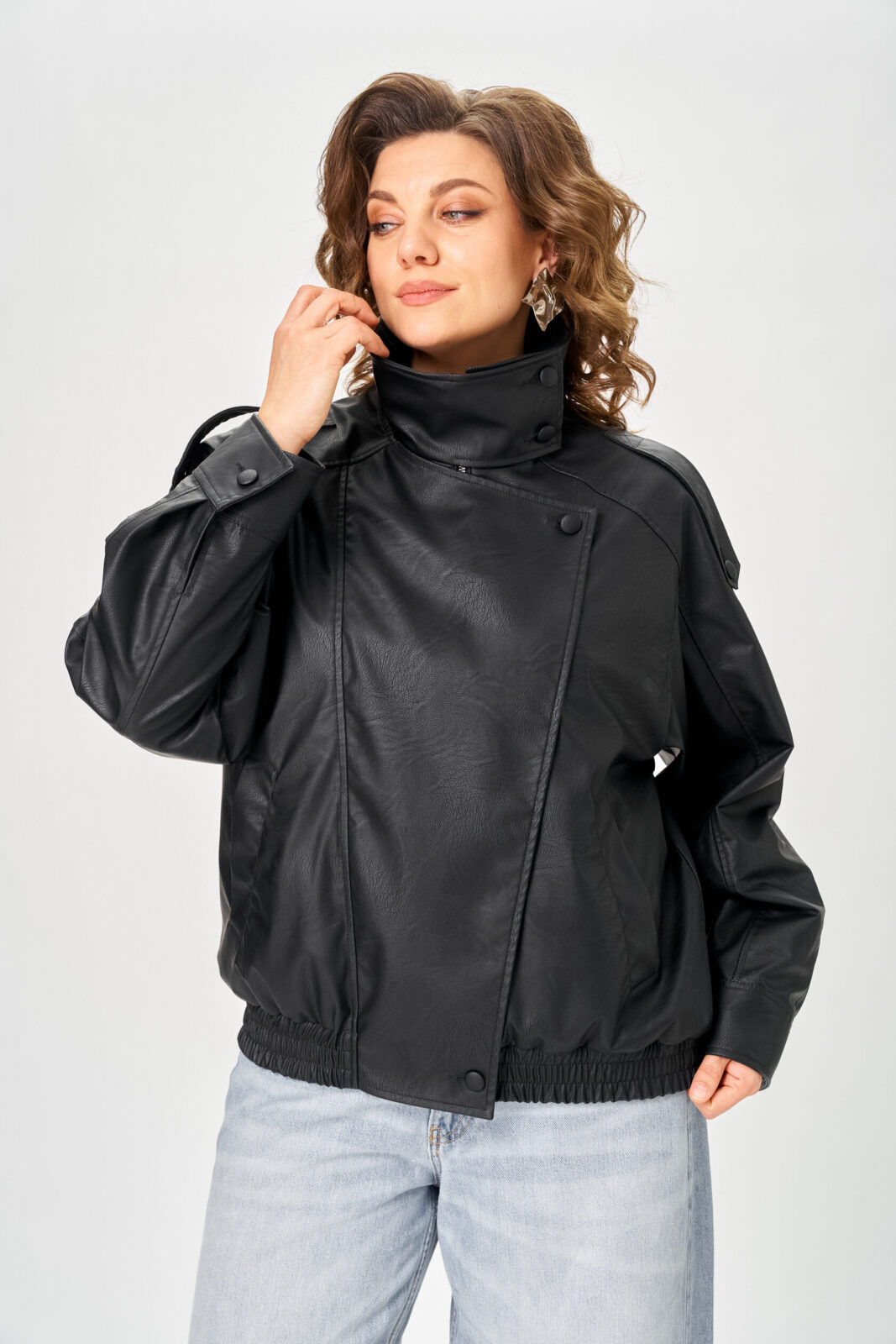 Стильная женская куртка oversize из экокожи. Модель дополнена центральной застёжкой на молнию и планкой на пуговицах. Вертикальные рельефы формируют силуэт, а отрезная кокетка на плечах с декоративными патами добавляет выразительности.