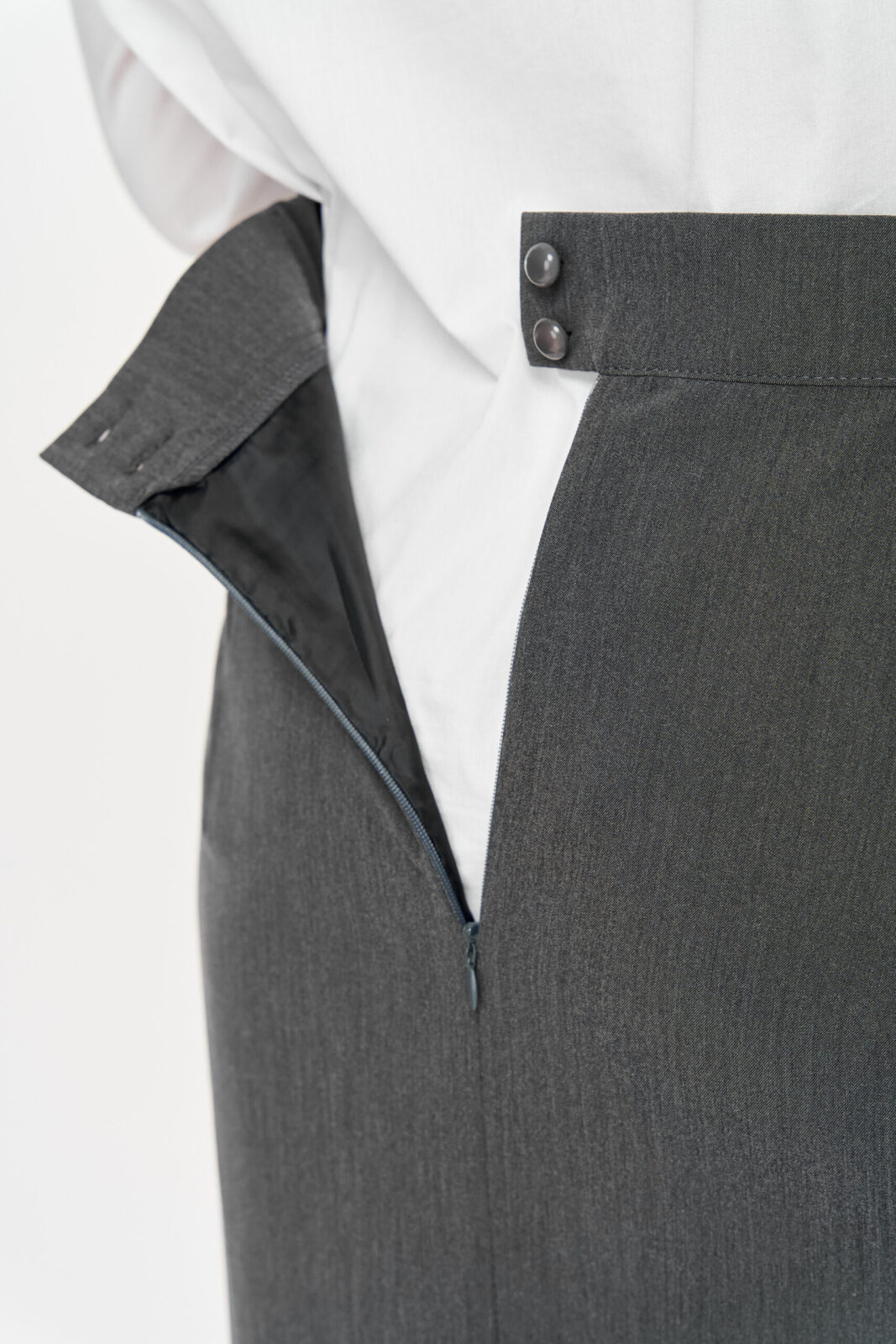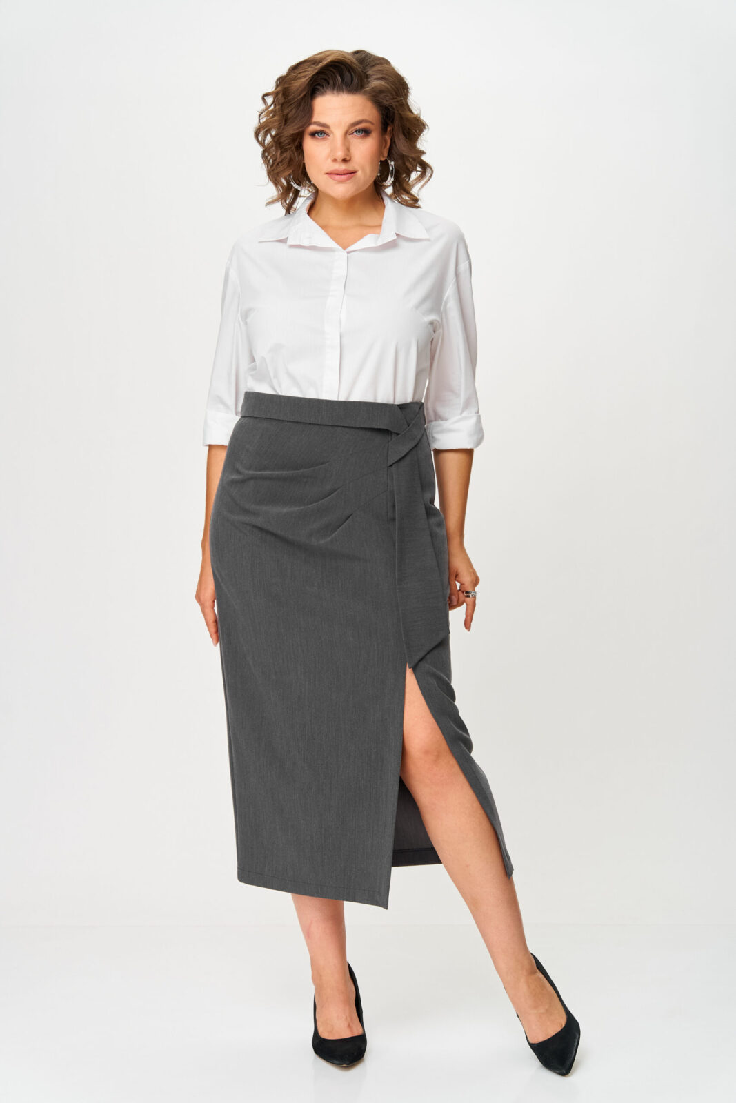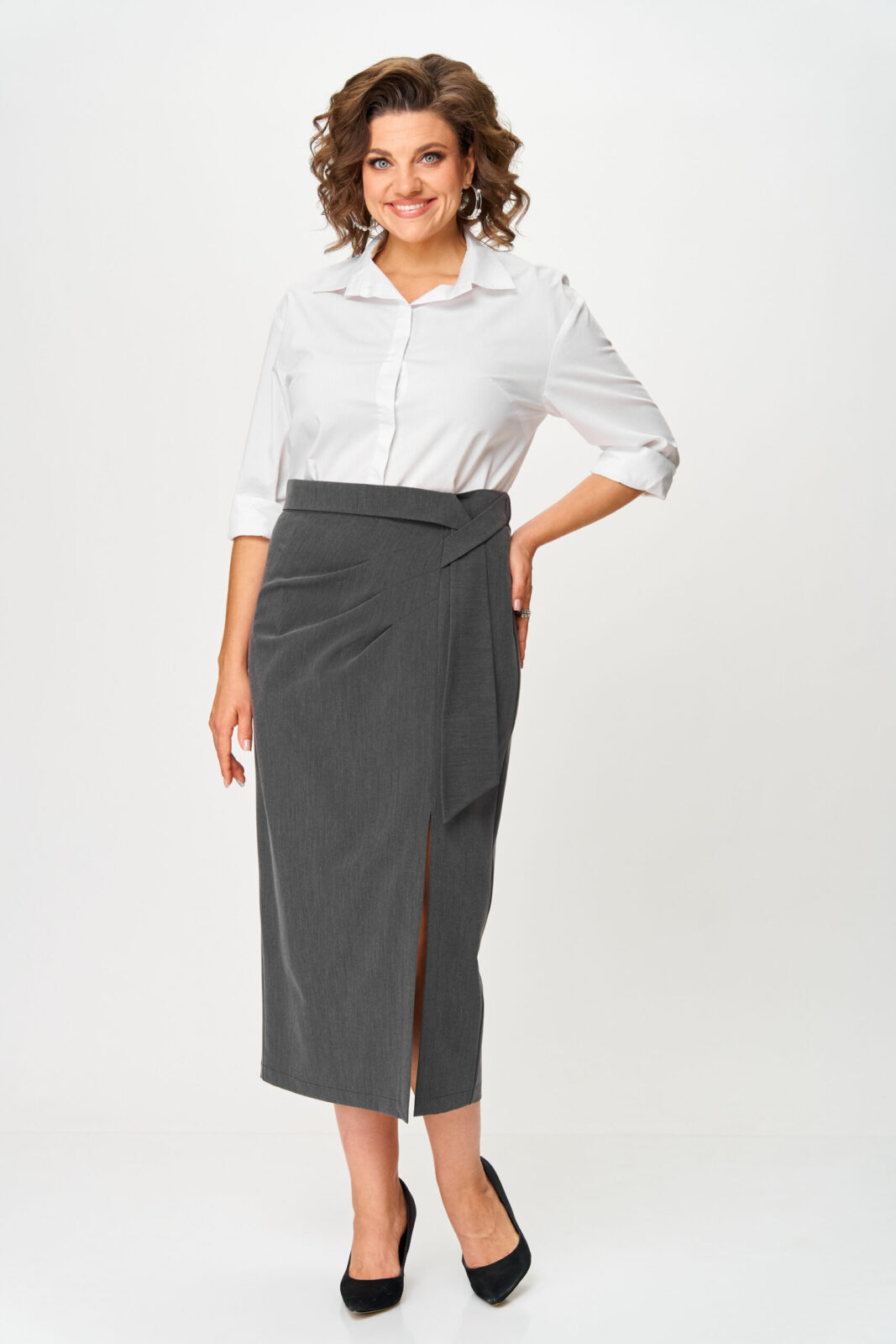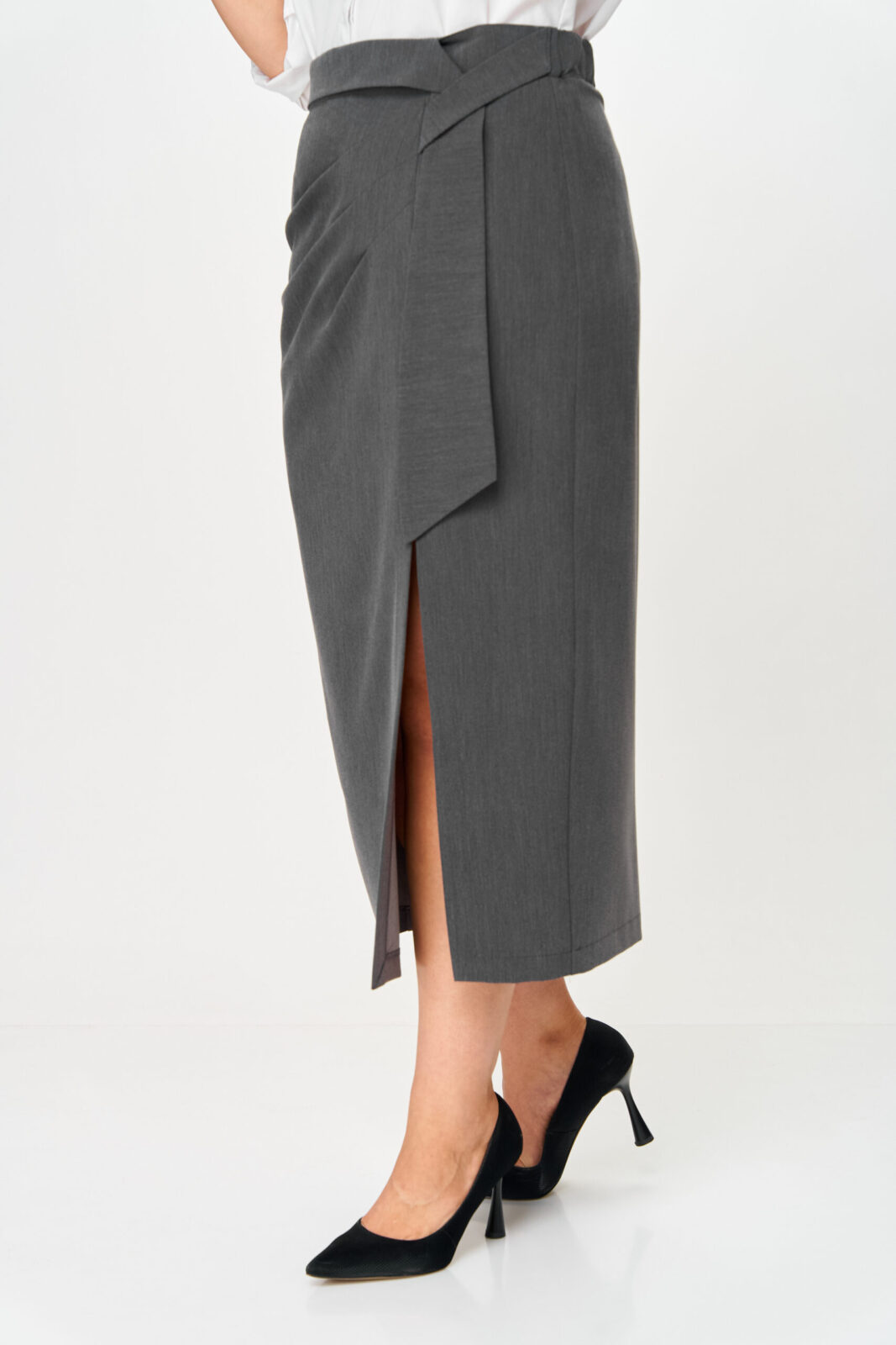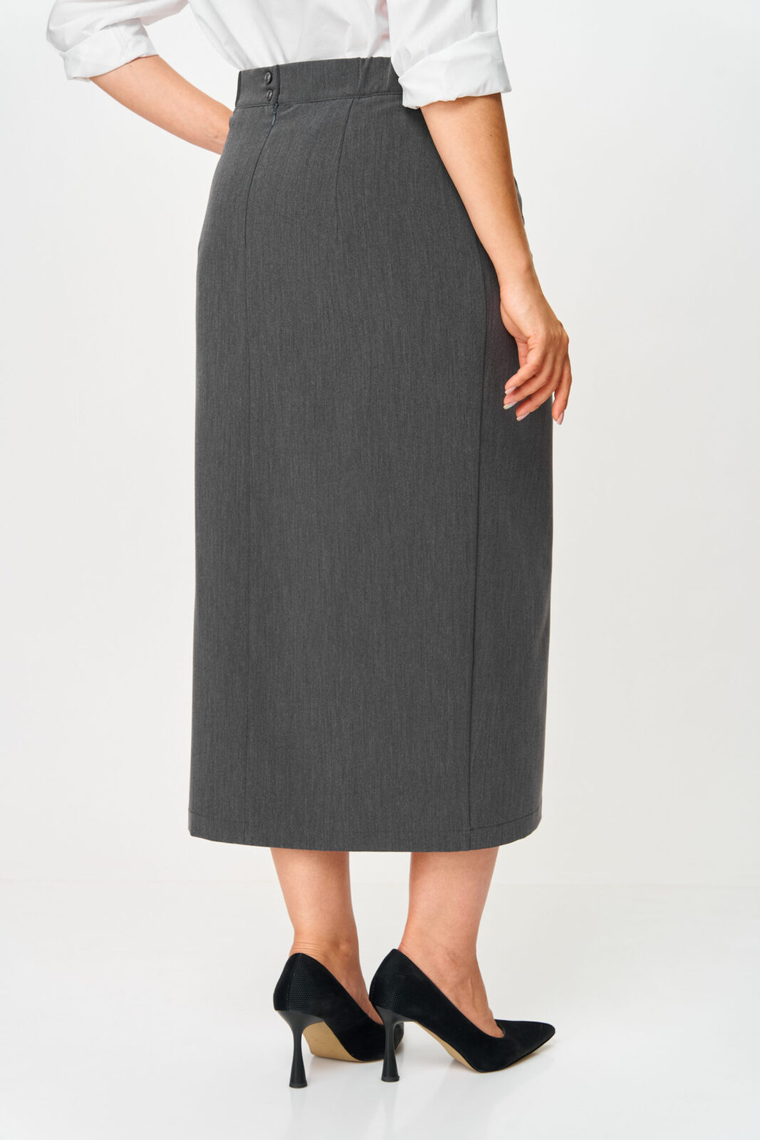 Юбка мягко облегает бёдра и плавно заужается к низу, создавая вытянутый силуэт. Разрез спереди добавляет лёгкость и делает образ более динамичным, а декоративные элементы придают модели характер и уникальность.