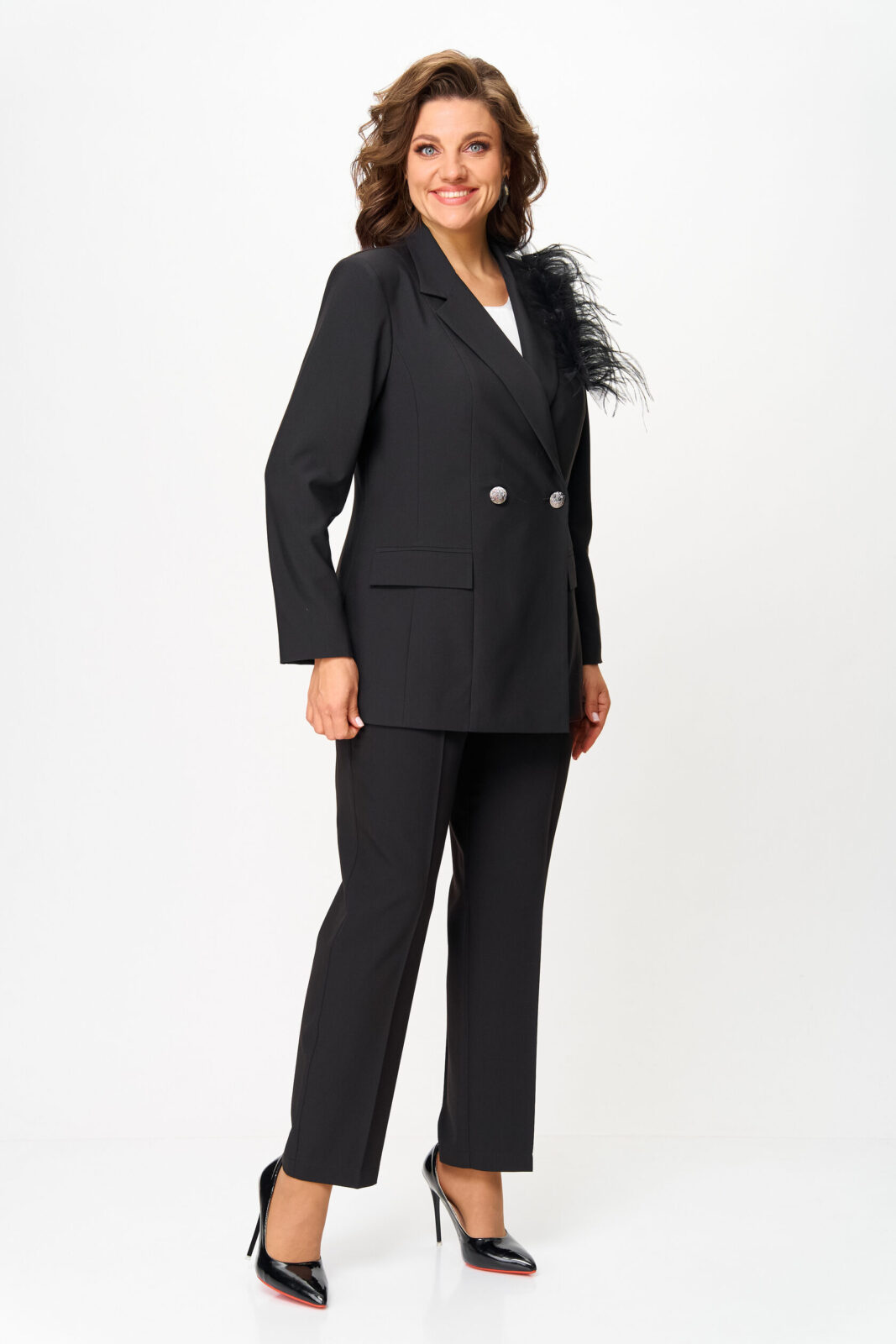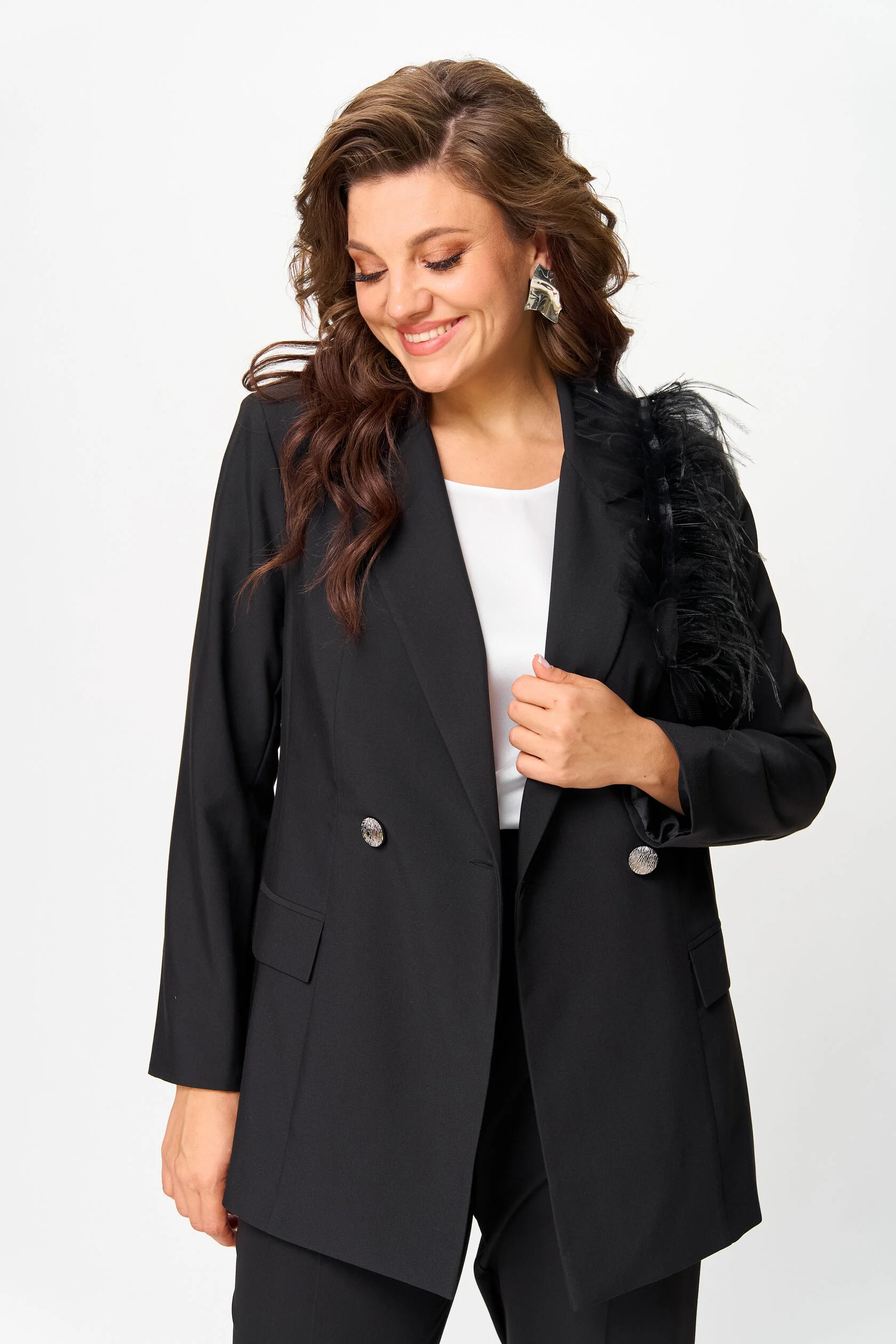 Жакет полуприлегающего силуэта, на подкладке, выполнен из костюмной однотонной ткани, в качестве отделки и декора использован фатин и тесьма с перьями.