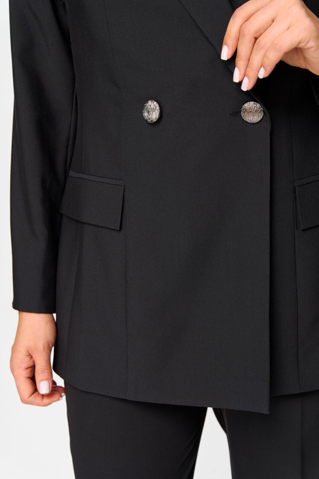 Полочка жакета с двубортной застежкой на петли и пуговицы, вертикальными рельефами и прорезным карманом с клапаном. Горловина V-образной формы, с отложными лацканами и воротником пиджачного типа. Спинка со средним швом и вертикальными рельефами. Рукав длинный, двухшовный, втачной.